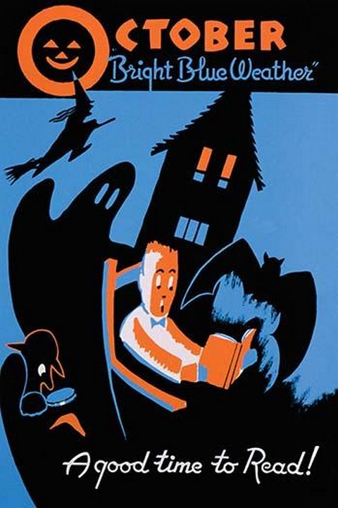 A good time to read.’ Poster for the WPA Statewide Library Project, showing a boy reading a book, surrounded by a bat, ghost, witch, and other images of Halloween1936/USA
