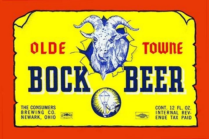 This is a label for Olde Towne Bock Beer brewed by the Consumer’s Brewing Company in Newark Ohio. It features a very happy and possibly inebriated goat on an old style parchment on this post-prohibition label. ‘Bock’ means Billy-goat in German.Unknown Date/USA