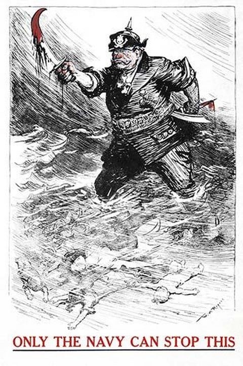 Poster showing a florid German soldier, wearing pirate skull-and-crossbones and brandishing a bloody sword as he wades in a tide of women’s and children’s bodies.1917/USA