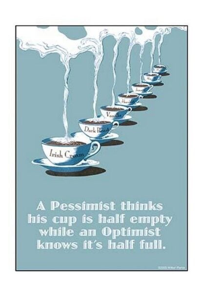 A pessimist thinks his cup is half empty while an optimist knows it’s half full.2005/USA