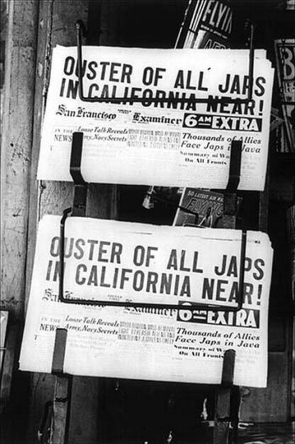 Headline of the San Francisco Examiner, in stand at 14th and Broadway, on February 27, 1942, announcing the imminent evacuation of persons of Japanese ancestry from military areas. On February 19, President Roosevelt gave the Secretary of War the power of excluding any person, alien, or citizen, from any area which might be required, on the grounds of military necessity. Evacuees of Japanese descent would be housed in War Relocation Authority centers for the duration of the war.1942/NoneSbout the Product: