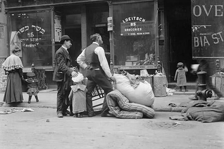 Outside of a Jewish Butcher Shop, Evictees look over their possessions; Out of their apartment and onto a New York East Side Street in the Jewish Ghetto; children are comfortedUnknown Date/USA
