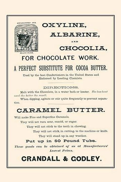 Page from the wholesale catalog of Crandall & Godley; manufacturers, importers, and jobber of baker’s, confections, and hotel supplies. Based in New York city. Selling a cocoa butter substitute1887/USA