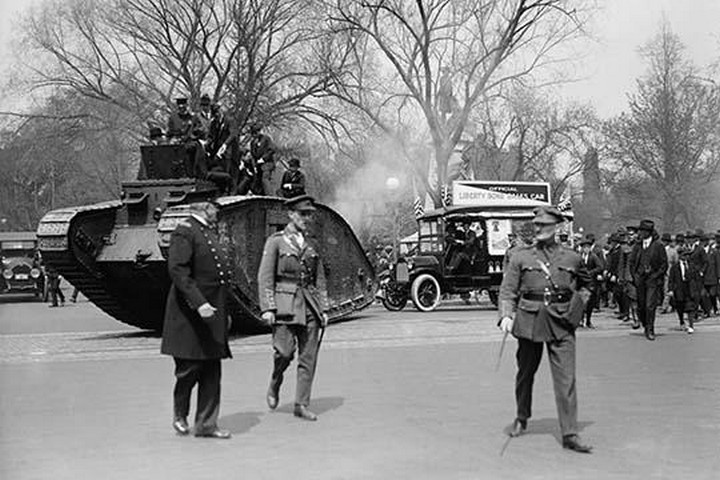 Parade of a Tank in a Washington Liberty Bond Parade replete with Military British & American Officers and Crowds of Parade Followers awed by the Spectacle of the Tracked Monster1918/USA