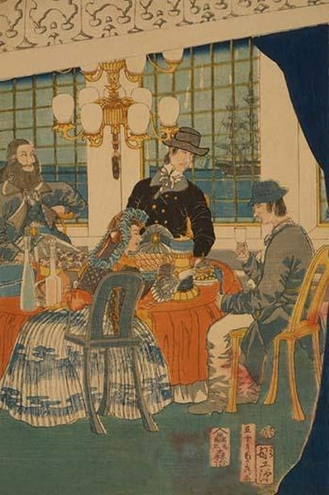 Japanese print, surviving part of a triptych, showing residents dining and listening to music at a foreign settlement house in Yokohama, Japan. Done by Utagawa Sadahide (1807-1873) in 1861.1861/Japan