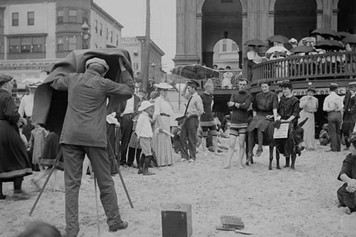 Photographer taking picture of group sitting on donkey at crowded beach, Atlantic City, N.J.Unknown Date/USA