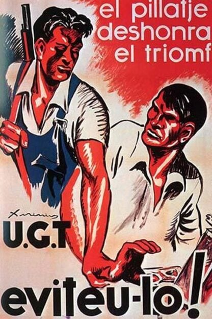 El Pillatje Deshonra el Triomf-Eviteu-lo!. A man with rifles warns another worker not to steal1939/Spain