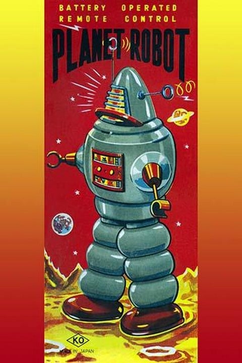 The 1950’s was a time of wonder and the universe was the focus of many young imaginations. Hollywood adopted science fiction and the toy industry followed closely. The Japanese manufactured toy robots for the children of America and designed great boxes to hold these vintage tin toys. This illustration art comes directly from these boxes.1950/Japan