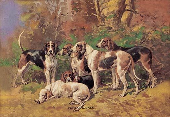 A pack of six dogs stand by the woods.1937/Britain