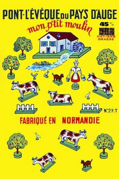 Label from a French cheese from the Pont Leveque region. Shows a farm scene with each part drawn as a children’s toy set.Unknown Date/France