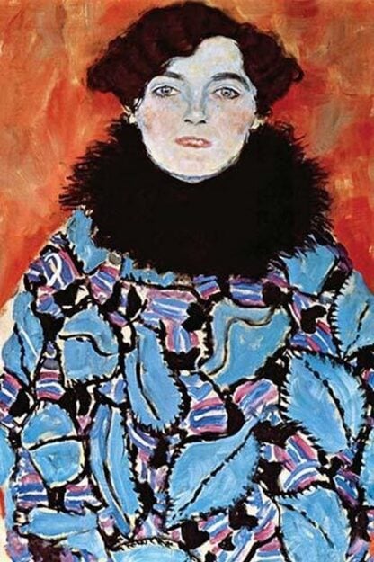 “Portrait of Johanna Staude” is an unfinished painting by the Austrian symbolist painter Gustav Klimt, completed in 1917-1918. The subject of the portrait is Johanna Staude (nee Widlicka), an Austrian divorcee who also modeled for the renowned artist Egon Schiele. Johanna Staude described herself as a language teacher and later as a painter, although no works of her own are known. Klimt’s portrayal of her is captivating and enigmatic, capturing the essence of a confident, modern woman. The painting features Staude in a fashionable short hair-cut and a black feather boa, boldly staring out at the viewer. The striking contrast between the turquoise fabric pattern of her blouse and the mandarin orange background evokes both French Fauvism and German Expressionism. Despite the bold patterns, Klimt draws attention to Staude’s expression, framed by the black feather collar. Her grey-green eyes convey a sense of melancholy, perhaps reflecting the bleak prospects of wartime Vienna. The portrait remains an intriguing glimpse into the world of a woman who defied convention and left an indelible mark on Klimt’s artistic legacy.