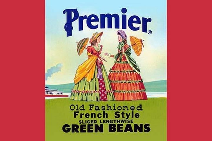 Original can label for Premier Old Fashioned French Style sliced lenghtwise Green Beans. Label shows women in fancy 1800’s attire.Unknown Date/USA