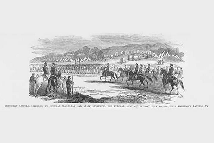 Frank Leslie was a prominent 19th-century American illustrator, publisher, and editor. He started as an illustrator for popular periodicals and established his own publishing company, “Frank Leslie’s Illustrated Newspaper,” which became one of the most successful and influential newspapers of its time. Leslie was also a pioneer in the use of photographs in journalism and established a photographic studio to create original images for his newspaper. He wrote several books and plays and was an important figure in the development of American media, shaping the way news was reported and disseminated. He died in 1880, leaving a lasting legacy.President Lincoln Reviews the Troops with General McClellanJuly 8, 1862/USA