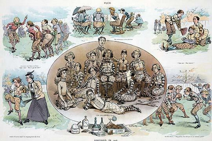 A Puck Magazine cartoon lampooning the sport of soccer / football in early America. Puck was a satirical magazine published in the United States from 1871 to 1918. It was founded by Joseph Keppler, a German-American cartoonist, and was the first successful humor magazine in the country.Puck was known for its political cartoons and satires, which often took aim at corrupt politicians and social issues of the day. It was particularly known for its anti-Semitic and anti-immigrant cartoons, which reflected the prejudices of the time.The magazine was published weekly and featured a mix of cartoons, articles, and humorous illustrations. It was popular among both the general public and political elites, and its success helped to establish the role of satire in American politics and culture.Puck was also notable for being the first magazine to feature the work of female cartoonists, including Nina Allender and Marie Duval.The magazine continued to be published until 1918, when it was merged with Judge magazine to form Judge and Puck. It remained in print until 1924, when it was finally discontinued.1906/USA
