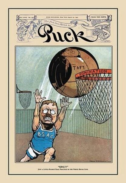 Puck Magazine: ‘Goal!; Just a Little Basketball Practice at the White House Gym.’ – Posters and prints on paper or canvas by standard digital or deluxe giclee printing.