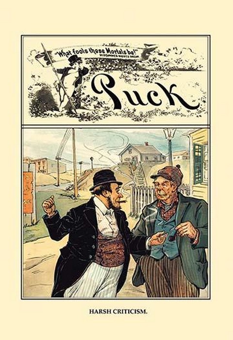 Puck was a satirical magazine published in the United States from 1871 to 1918. It was founded by Joseph Keppler, a German-American cartoonist, and was the first successful humor magazine in the country.Puck was known for its political cartoons and satires, which often took aim at corrupt politicians and social issues of the day. It was particularly known for its anti-Semitic and anti-immigrant cartoons, which reflected the prejudices of the time.The magazine was published weekly and featured a mix of cartoons, articles, and humorous illustrations. It was popular among both the general public and political elites, and its success helped to establish the role of satire in American politics and culture.Puck was also notable for being the first magazine to feature the work of female cartoonists, including Nina Allender and Marie Duval.The magazine continued to be published until 1918, when it was merged with Judge magazine to form Judge and Puck. It remained in print until 1924, when it was finally discontinued.1900/USA