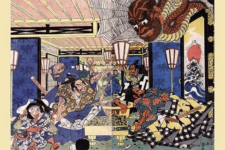 Raiko shitenno to tsuchigumo. Ukiyo-e print illustration showing an interior view of room with Minamoto Yorimitsu and another man at a Go gameboard as a demon crashes through the roof.1782/Japan