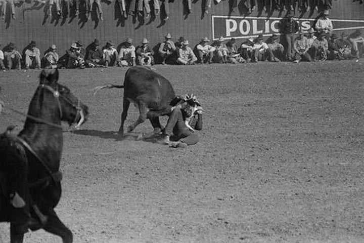 Rodeo at the San Angelo Fat Stock Show in San Angelo Texas with a cowboy bulldogging a calf.1940/USA