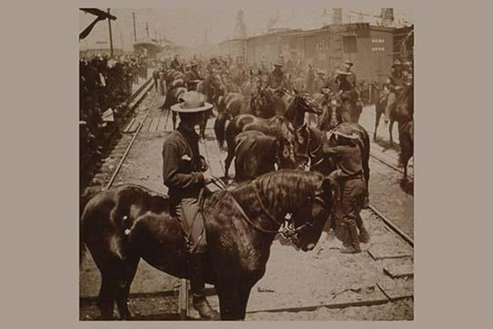 Crowded Scene of horses and riders disembarking from trains at Tampa on their way to Cuba1898/USA