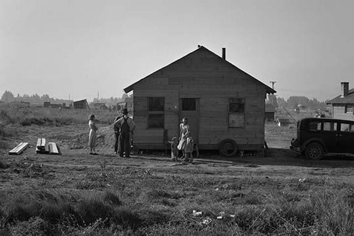 Mother and two children, husband, his brother and brother’s wife shown. Near Klamath Falls, Oregon. Rural shack community on outskirts of town1939/USA