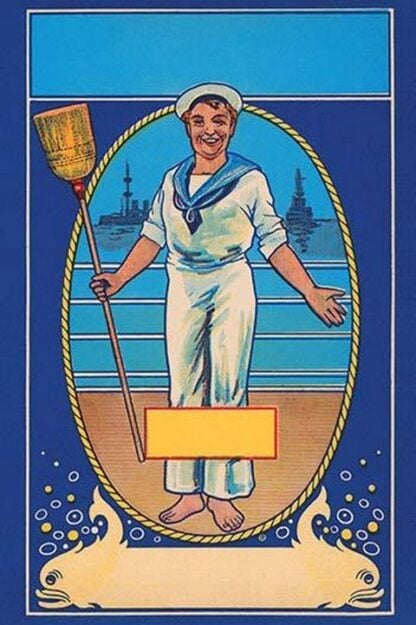 This image if from an original broom label. Applied as a sticker to the stem of brooms to identify the maker and prove to consumers that one was better than all the others. These date from around 1910. Brooms lost their market share after the advent of the vacuum. This ‘blank’ featured a sailor and WWI era battleships.Unknown Date/USA