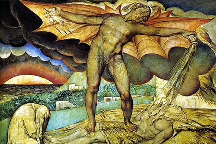 “Satan Smiting Job with Sore Boils,” a painting by William Blake, is a powerful and evocative work that delves into the biblical story of Job, highlighting Blake’s unique artistic and theological perspective. Created in 1826, this watercolor painting forms part of a larger series illustrating the Book of Job. In this piece, Blake portrays the torment inflicted upon Job, a pious and faithful man tested by Satan under God’s permission. The scene is intense and dramatic: Job, depicted as an emaciated and suffering figure, is shown writhing in agony on the ground, his body covered with painful boils. Surrounding him, his despairing wife and friends look on in horror and helplessness. Satan, characterized by Blake with a menacing and almost skeletal appearance, looms over Job, emphasizing his role as the bringer of suffering. The composition is stark and compelling, utilizing a limited color palette that underscores the bleakness and despair of the moment. Blake’s use of light and shadow adds depth and emotion to the scene, highlighting the contrast between Job’s innocence and Satan’s malevolence. The painting is rich with symbolic elements: the tormented posture of Job signifies human vulnerability and suffering, while Satan’s dominant stance represents the omnipresent threat of evil. Blake, known for his complex and often unconventional interpretations of biblical themes, imbues this work with his distinctive vision, blending his poetic sensibility with his illustrative skills. The painting not only illustrates a pivotal moment from the biblical narrative but also reflects Blake’s broader themes of innocence, suffering, and the struggle between good and evil. “Satan Smiting Job with Sore Boils” remains a testament to Blake’s profound ability to capture and convey deep spiritual and emotional truths through his art.