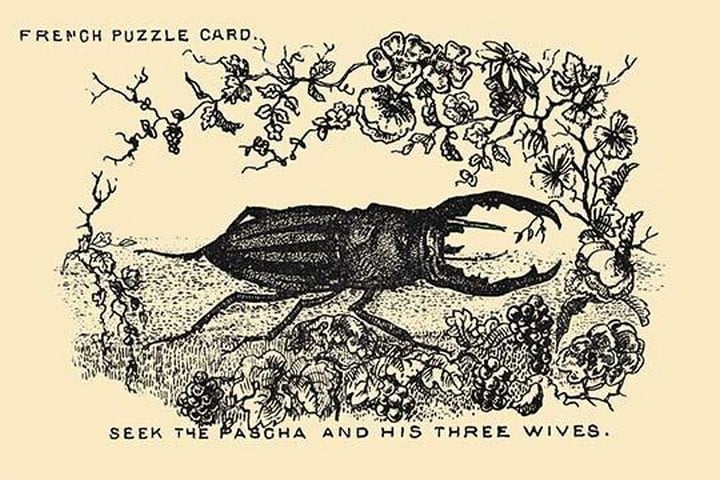 Hidden in this picture of a beetle is a Pascha and three woman. Where are there? This image dates from the turn of the century and was the face of a trade card used as advertising. The trick here was a series of hidden pictures that children could look for.1881/USA