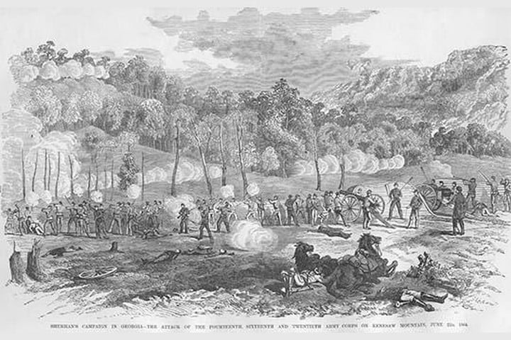 Frank Leslie was a prominent 19th-century American illustrator, publisher, and editor. He started as an illustrator for popular periodicals and established his own publishing company, “Frank Leslie’s Illustrated Newspaper,” which became one of the most successful and influential newspapers of its time. Leslie was also a pioneer in the use of photographs in journalism and established a photographic studio to create original images for his newspaper. He wrote several books and plays and was an important figure in the development of American media, shaping the way news was reported and disseminated. He died in 1880, leaving a lasting legacy.Sherman Attacks at Kennesaw Mountain, GeorgiaJune 22, 1864/USA
