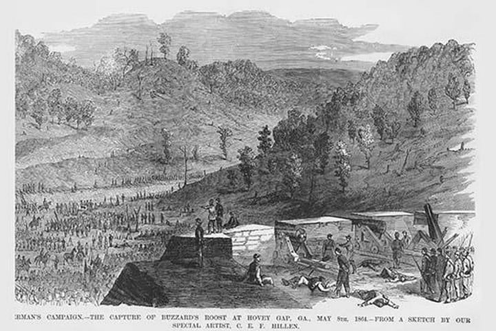 Frank Leslie was a prominent 19th-century American illustrator, publisher, and editor. He started as an illustrator for popular periodicals and established his own publishing company, “Frank Leslie’s Illustrated Newspaper,” which became one of the most successful and influential newspapers of its time. Leslie was also a pioneer in the use of photographs in journalism and established a photographic studio to create original images for his newspaper. He wrote several books and plays and was an important figure in the development of American media, shaping the way news was reported and disseminated. He died in 1880, leaving a lasting legacy.Sherman Capture of Buzzard’s Roost at Hovey Gap, GeorgiaMay 8, 1864/USA