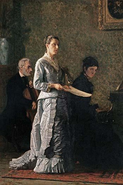 For this domestic scene, his most ambitious, Eakins invited two of his Pennsylvania Academy students to act out a home musicale. Margaret Alexina Harrison sings and Susan Hannah Macdowell (whom Eakins would marry in 1884) plays the piano in a nondescript parlor, where they are joined by the accomplished Philadelphia cellist Charles Stolte. Eakins created an arrangement that would handicap an actual chamber ensemble by enlarging the pianist and placing the cellist behind her, where he cannot make eye contact with his fellow performers. By simplifying the composition and focusing on the singer, who holds a note-apparently of a ‘pathetic song’ that could move a listener to tears. Eakins transcends a specific moment in a particular parlor to tell an emblematic story of the power of music.1881/Corcoran Gallery, Washington, DC