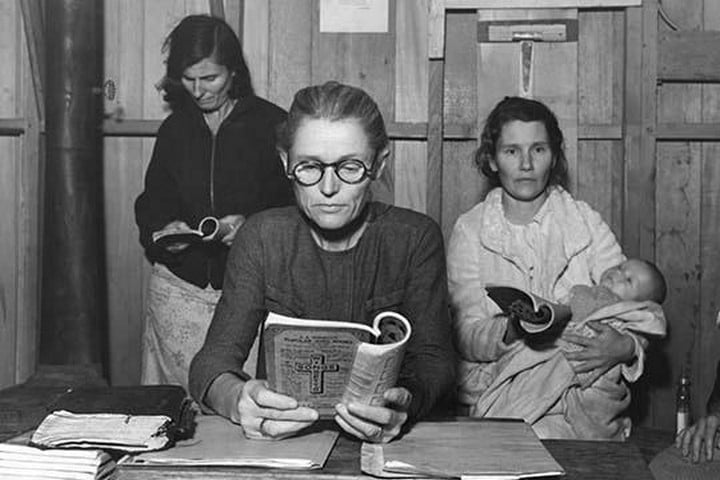 Singing hymns before opening of meeting of Mothers’ Club at Arvin Farm Security Administration (FSA) camp for migrants, California1938/USA