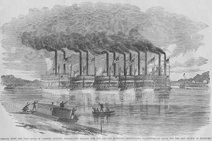 Frank Leslie was a prominent 19th-century American illustrator, publisher, and editor. He started as an illustrator for popular periodicals and established his own publishing company, “Frank Leslie’s Illustrated Newspaper,” which became one of the most successful and influential newspapers of its time. Leslie was also a pioneer in the use of photographs in journalism and established a photographic studio to create original images for his newspaper. He wrote several books and plays and was an important figure in the development of American media, shaping the way news was reported and disseminated. He died in 1880, leaving a lasting legacy.Six Steamboats Carry Federal Troops from Pennsylvania down the Ohio River to the Front in Kentucky1861/USA