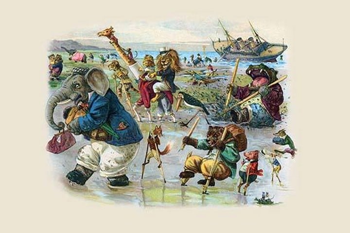 A stranded ship is left abandoned. The animals escape on stilts as to not get muddy on the flats. Still some may not have a choice as the crutches can break. The Animals Trip to the Sea was a children’s book from the turn of the century. It was a tale of adventure for anthropomorphic animals written by Clifton Bingham and illustrated by G.H. Thompson.1900/USA / UK