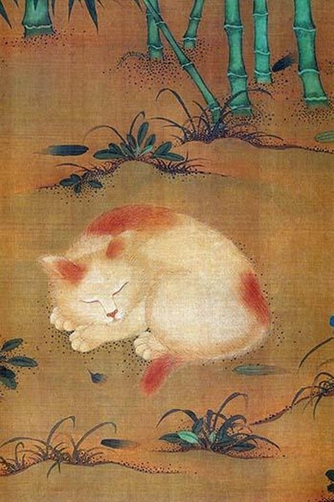 A scroll painting from the Qing dynasty showing a sleeping cat in a garden.Unknown Date/China