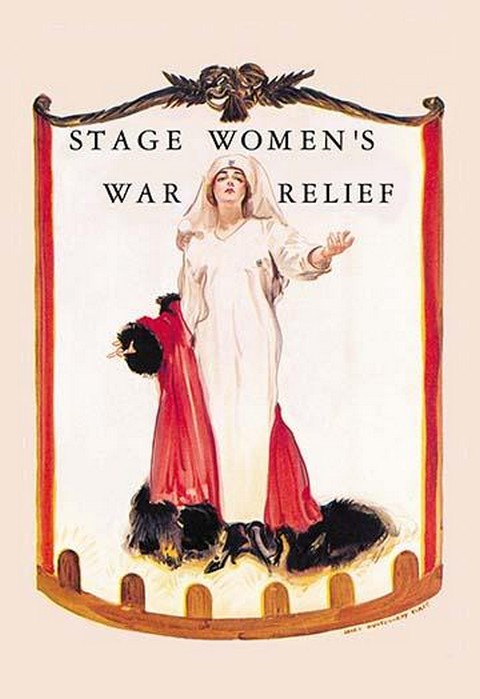 James Montgomery Flagg (1877-1960) was an American artist and illustrator. He is most famous for his war effort posters but he also work for magazines, did cartoons, and even paintings. Poster showing a woman on stage, throwing off a scarlet, fur-trimmed cloak to reveal her white volunteer’s uniform1918/USA