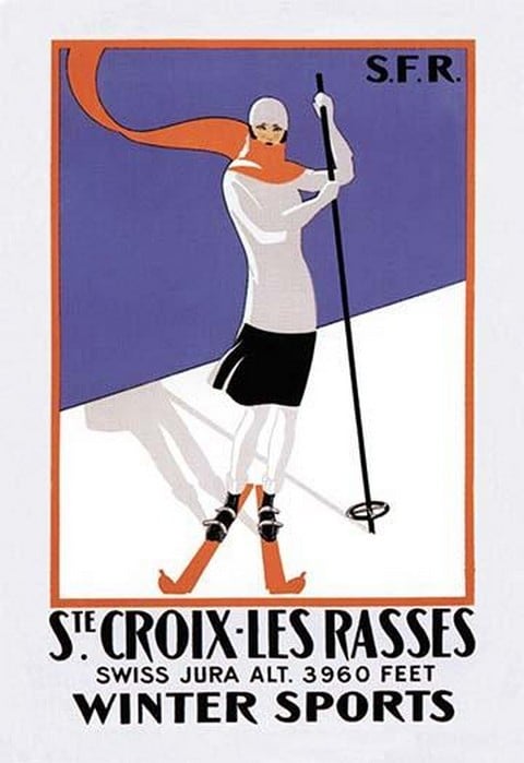 Swiss Railways travel poster made for the english speaking market to induce skiers to come to the Swiss alps for a winter sport holiday. Les Rasses is in the Northwest corner of Switzerland near the French border.1922/Switzerland