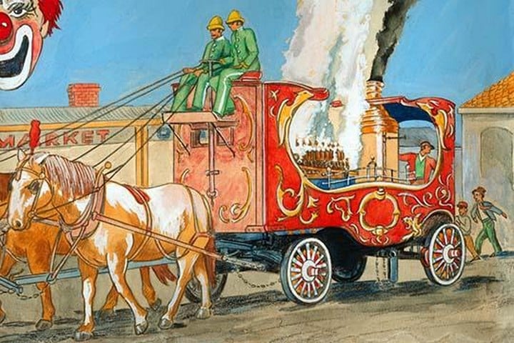 Painting of a parade wagon from one of the most spectacular circus parades; the ‘Golden Age Of Chivalry.’ Constructed in 1903 for the Barnum & Bailey Circus, it has paraded in the streets of almost every major city in America. The steam calliope is also known as a steam organ or steam piano. In the age of steam, the steam calliope was particularly employed on riverboats and in circuses. Circus calliopes traditionally came last in parades. Some circus calliopes were self-contained, mounted on a carved, painted and gilded wagon pulled by horses, but the presence of other steam boilers in the circus meant that fuel and expertise to run the boiler were readily available.1940/USA