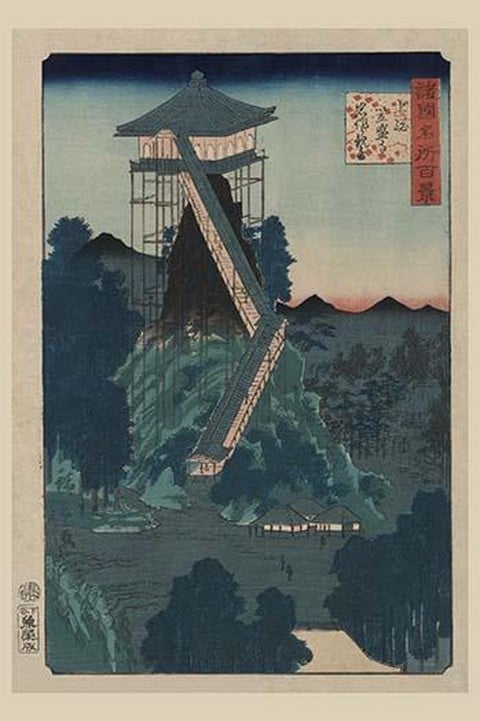 Print shows a temple built on stilts with a long covered stairway leading up to it on top of a mountain. From the series: ‘Shokoku meisho hyakkei : 100 famous views of Japan.’ Done by Utagawa Hiroshige (1842-1894) around 18591859/Japan