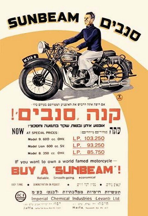 This advertisiment is for the market in Israel with sales offices in Haifa and Jaffa. Sunbeam was a British manufacturing marque that produced bicycles and motorcycles from 1912 to 1956.Unknown Date/Israel