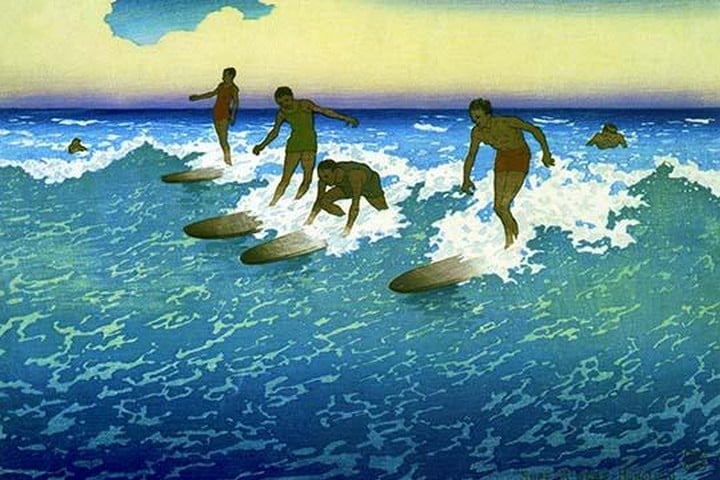 Five surfers riding waves by Charles William Vartlett (1860-1940)1920/USA