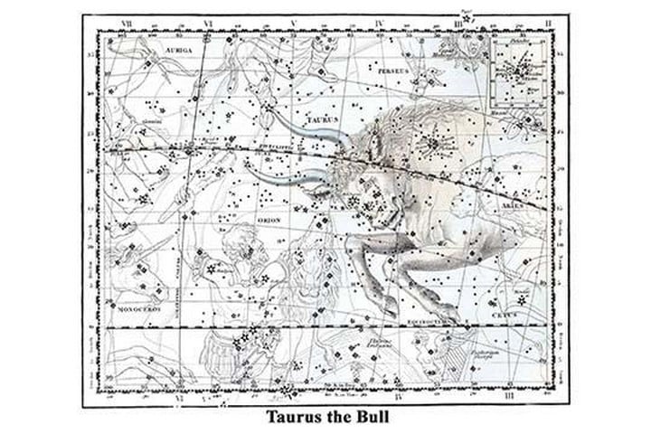 Taurus is one of the constellations of the zodiac. Its name is a Latin word meaning ‘bull’, and its astrological symbol is a stylized bull’s head: (Unicode ?). Taurus is a large and prominent constellation in the northern hemisphere’s winter sky, between Aries to the west and Gemini to the east; to the north lie Perseus and Auriga, to the southeast Orion, to the south Eridanus, and to the southwest Cetus.1822/London