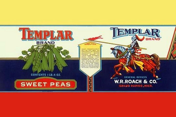 Original can label for sweet peas showing a knight templar in full armor on horsebackUnknown Date/USA