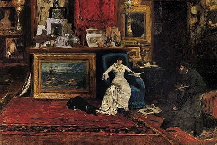 Chase, who is almost lost in the shadows at the right, portrays himself holding his palette as if pausing from work, but he leaves it to the viewer to deduce whether the young woman with whom he chats is a model, a patron, or a friend. Her listlessness and immersion in an aesthetic interior make her seem like a precious object, a simile embraced by many artists and collectors of the period. Her association with art reflects women’s roles as consumers and keepers of culture and arbiters of taste. Chase encoded his professional ambitions in the opulent decor of his Greenwich Village studio and in his painted accounts of it. Packed with works of art and souvenirs of travel, the studio showcased Chase’s refinement and connection with tradition; provided a place for display, contemplation, and professional entertaining; and offered a retreat from urban confusion.1880/Saint Louis Art Museum