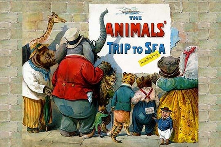 The Animals Trip to the Sea was a children’s book from the turn of the century. It was a tale of adventure for anthropomorphic animals written by Clifton Bingham and illustrated by G.H. Thompson. This is the cover illustration.1900/USA / UK