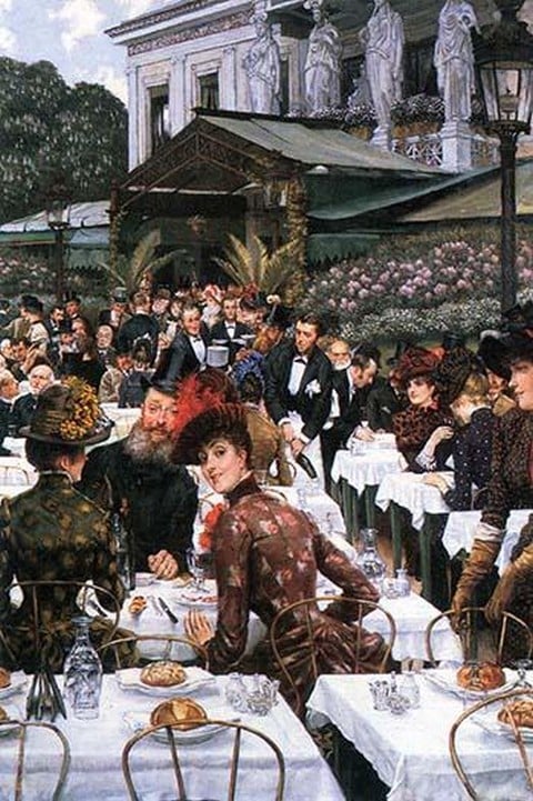 The Artist’s Wives (1885, also called “The Artist’s Ladies”) depicts a gathering of artists and their wives on the evening before the official opening of the the annual art exhibition known as the Salon. The occasion was referred to as Varnishing Day. The artists could put a final coat of protective varnish on their work, and they, the artist’s wives and their friends could view the exhibition privately. There is a great air of celebration when €œthe great effort of the year is over, and when our pictures are safely hung, and are inviting the critics to do their worst and the buyers to do their best!€ A grand banquet in the open air with hundreds of women seated on white linen bedecked tables are being served by waiters. The crowd includes a sprinkling of formally dressed men. In “The Artist’s Wives” James Tissot depicts this traditional celebratory luncheon on the terrace of the Cafe Ledoyen, The entrance to the Palais de l€™Industrie can be seen in the background.1885/France