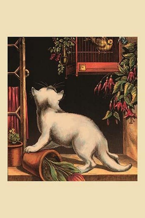 The kitten is foiled in the attempt to catch that bird because a cage separates them.1877/USA