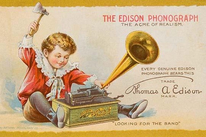 A very early advertisment for the phonograph, a record player, invented by Thomas Alva Edison. The ad shows a boy attacking the machine with a hatchet.Unknown Date/USA