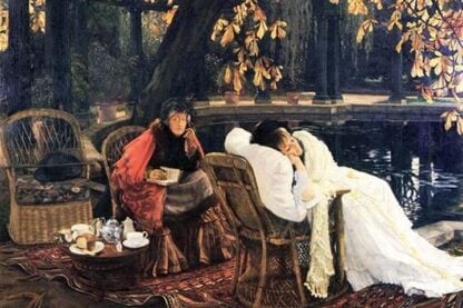 An old woman reads to a girl who is reclining on a pillow; they sit beside a pond on wicker chairs1865/France
