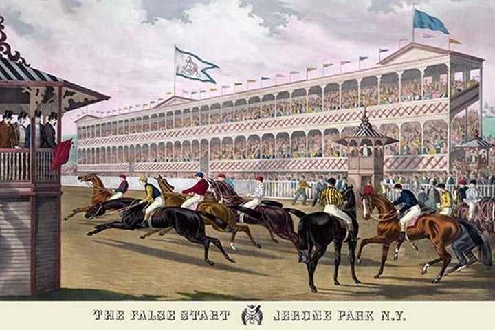 Horses in front the grandstand are eager to get started in front of the judges stand and grandstand1868/USA