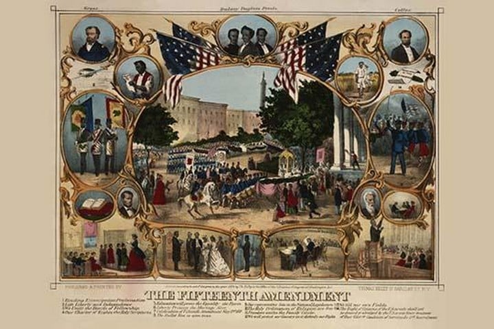 Parade surrounded by portraits and vignettes of Black life, illustrating rights granted by the 15th amendment. The 15th Amendment to the United States Constitution, ratified in 1870, was a landmark moment in American history. It granted African American men the right to vote, declaring that the “right of citizens of the United States to vote shall not be denied or abridged by the United States or by any State on account of race, color, or previous condition of servitude.” The amendment aimed to abolish discriminatory voting practices such as poll taxes and literacy tests, which had disenfranchised African Americans in many states. Despite its significance, the 15th Amendment faced challenges and was not fully enforced until the Voting Rights Act of 1965. Nevertheless, it marked a crucial step toward ensuring equal voting rights for all citizens regardless of race, laying the groundwork for further advancements in civil rights and democracy in the United States.1870/Unknown Place
